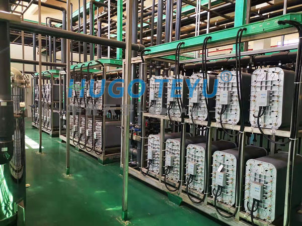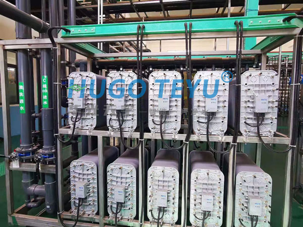EDI膜堆主要由交替排列的陽離子交換膜、濃水室、陰離子交換膜、淡水室和正、負電組成。在直流電場的作用下,淡水室中離子交換樹脂中的陽離子和陰離子沿樹脂和膜構成的通道分別向負和正方向遷移,陽離子透過陽離子交換膜,陰離子透過陰離子交換膜,分別進入濃水室形成濃水。同時EDI進水中的陽離子和陰離子跟離子交換樹脂中的氫離子和氫氧根離子交換,形成超純水(高純水)。超電流使水電解產生的大量氫離子和氫氧根離子對離子交換樹脂進行連續的再生。傳統的離子交換,離子交換樹脂飽和后需要化學間歇再生。而EDI膜堆中的樹脂通過水的電解連續再生,工作是連續的,不需要酸堿化學再生。